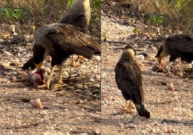 Um caracará (Caracara plancus) foi filmado pela nossa equipe capturando um pequeno tatu, possivelmente um filhote, na Transpantaneira, no Pantanal de Mato Grosso.