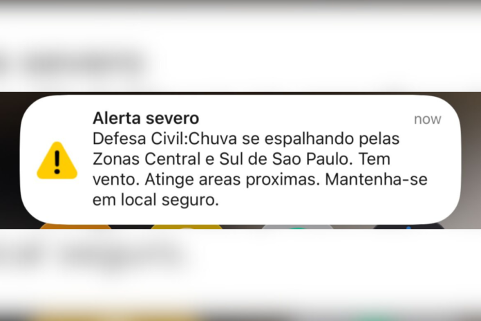 “Chuva se espalhando pelas zonas central e sul de São Paulo. Tem vento. Atinge áreas próximas. Mantenha-se em local seguro”, dizia a mensagem. O aviso foi enviado aos aparelhos celulares às 16h53.