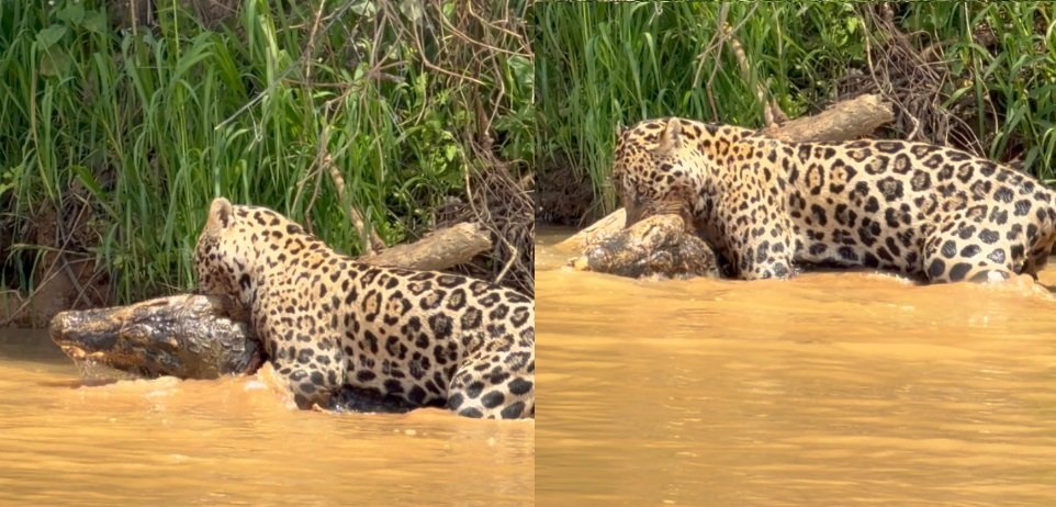 Logo pela manhã, o animal já havia sido abatido. Em seguida, a cena chamou ainda mais atenção: a onça capturou uma piranha que tentava se alimentar da carcaça, um retrato direto da dinâmica da vida selvagem.