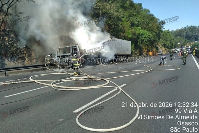 Caminhão pegou fogo na altura do quilômetro 20 da Anhanguera em Osasco. Com interdição parcial, rodovia registrou 3 km de congestionamento